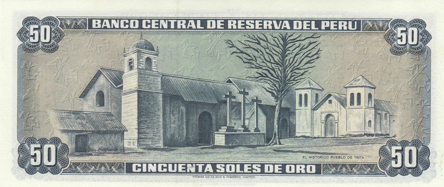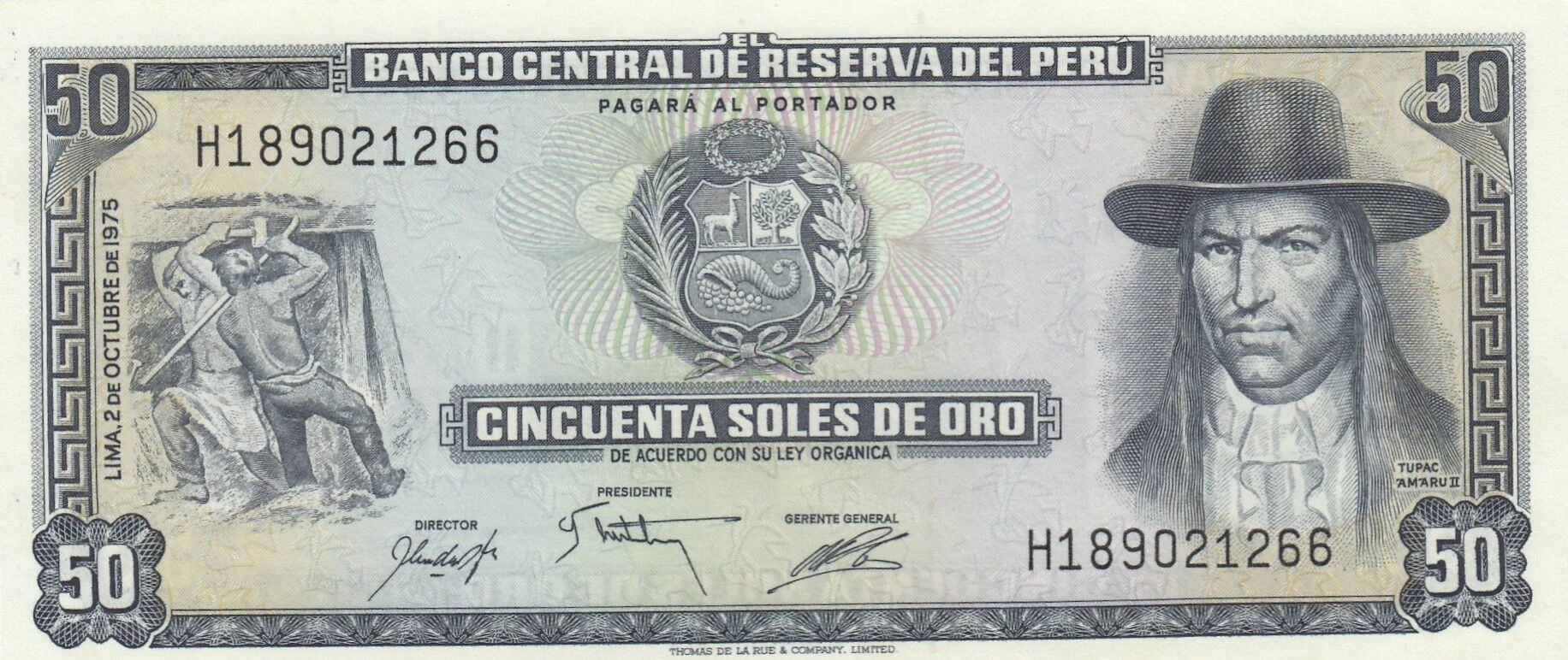 Le billet de 50 Soles péruviens, émis le 2 octobre 1975, présente sur son recto une composition iconographique significative. À gauche, une représentation de travailleurs symbolise la force laborale du pays, tandis que l'effigie de Tupac Amaru II, figure emblématique de la résistance indigène, occupe également cet espace. Les armoiries nationales sont positionnées au centre du billet. Le nom de l'institut émetteur est imprimé en haut, et la valeur faciale est indiquée en chiffres aux quatre coins. La valeur en lettres est inscrite sous les images, et la date d'émission est placée verticalement à gauche.