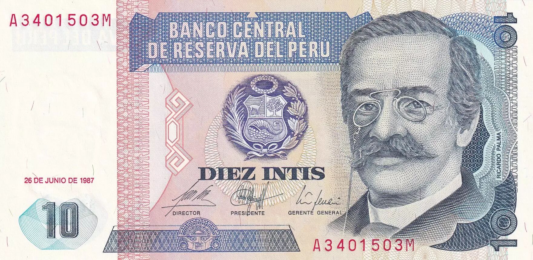 Home > > Peru 10 Intis - Ricardo Palma - Agriculture - 1987 - Serial A-M - P.129