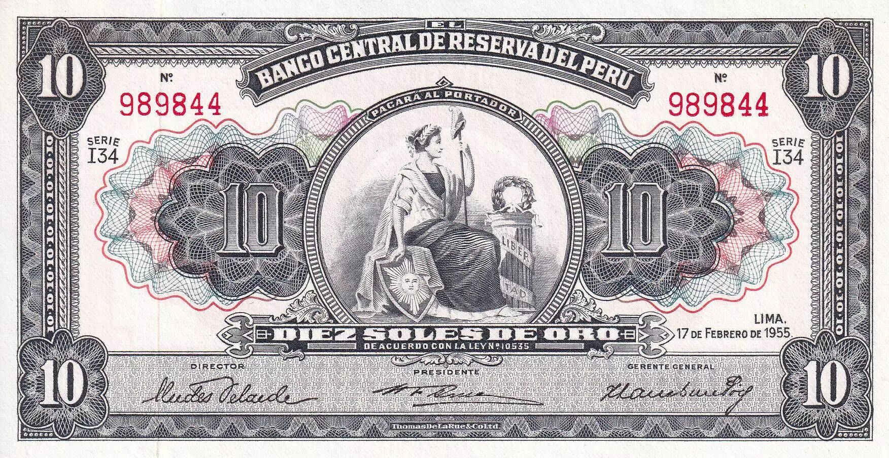 Banknote Peru 10 Soles de Oro - Seated Liberty - 17-02-1955 - Serial 134 - UNC - P.71
