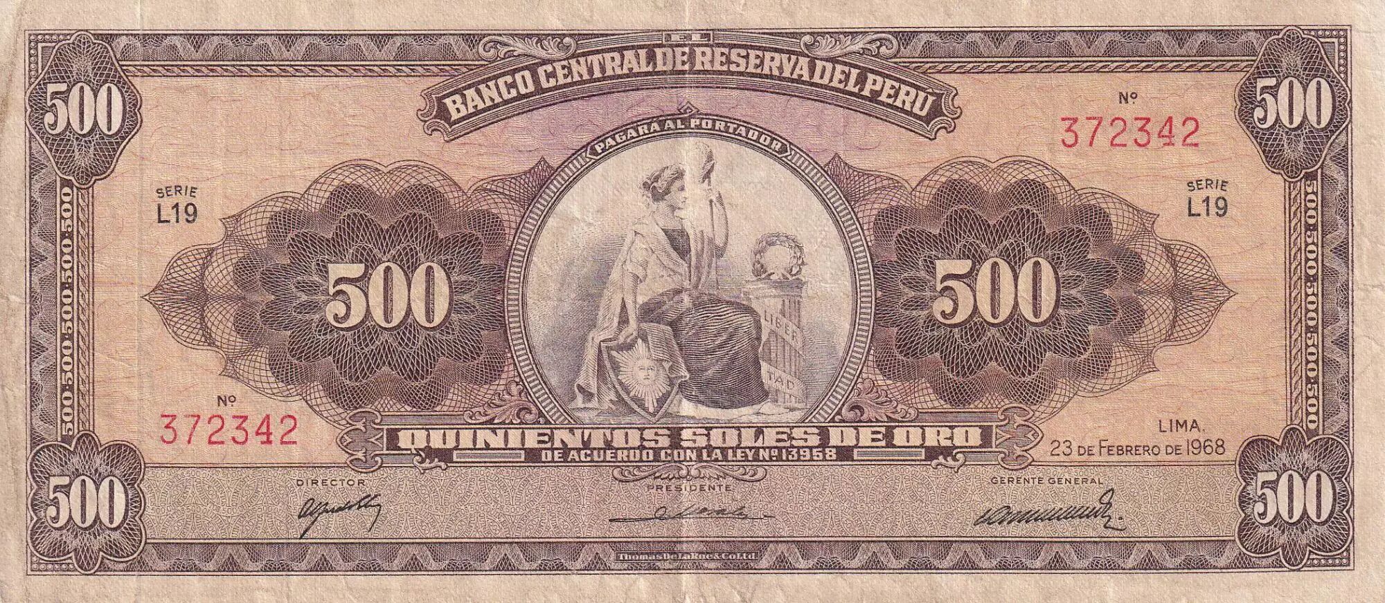 Banknote Peru 10 Soles de Oro - Seated Liberty - 23-02-1968 - Serial L19 - F to VF - P.87