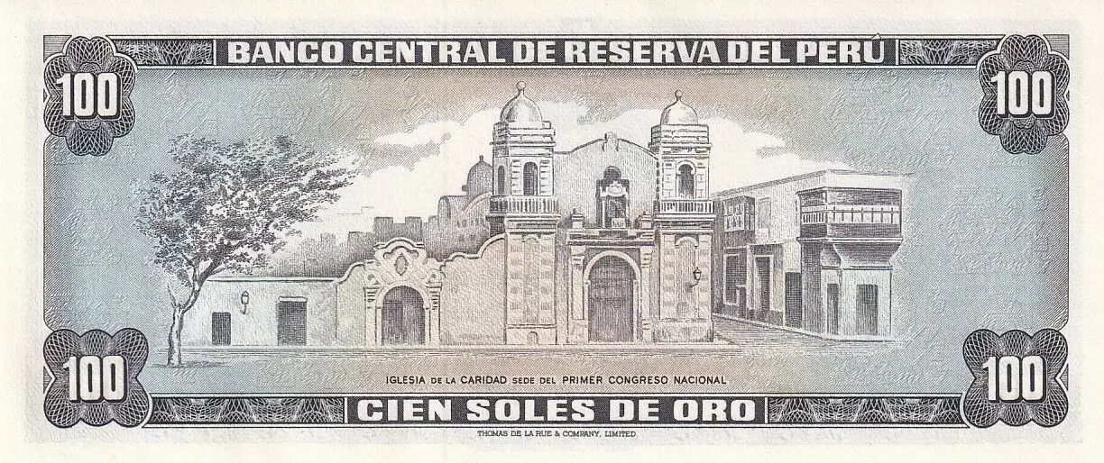 The reverse of the banknote illustrates a church, a historical site that hosted the country's first national congress. As on the obverse, the name of the financial institution, Banco Central De Reserva Del Peru, and the face value, Cien Soles De Oro, are present.