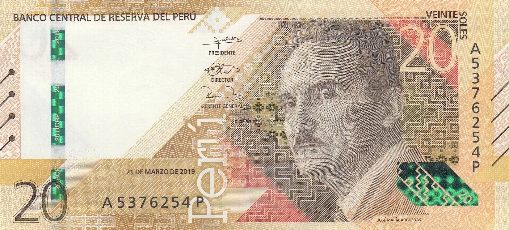 The 20 Soles banknote issued by Peru in 2019 pays tribute to José María Arguedas Altamirano. This is a commemorative banknote, part of the A-P series.