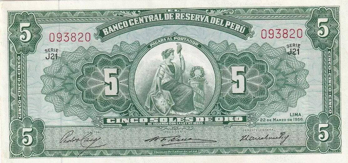 This Peruvian banknote was issued in 1956 by the Banco Central de Reserva del Perú. With a face value of five soles de oro, it belongs to the J21 series.