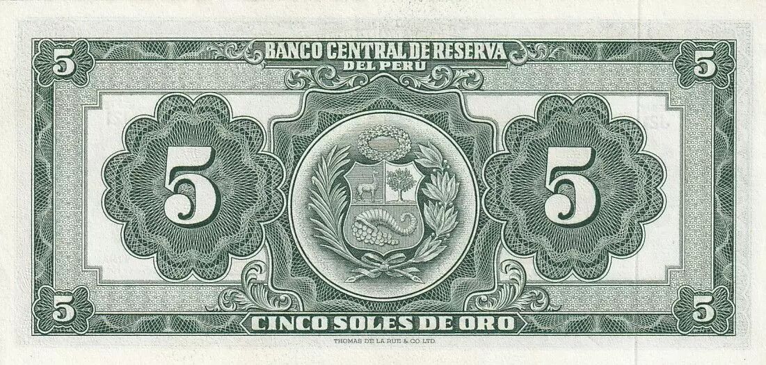 The back of the banknote features a green print. The national coat of arms of Peru is located in the center. The denomination "CINCO SOLES DE ORO" and the name of the issuing institution, "BANCO CENTRAL DE RESERVA DEL PERU", are also found there.