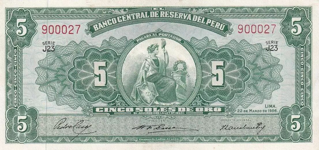 The 5 Soles banknote, issued in 1956, belongs to the J23 series. It was manufactured by the printer Thomas de la Rue in London.