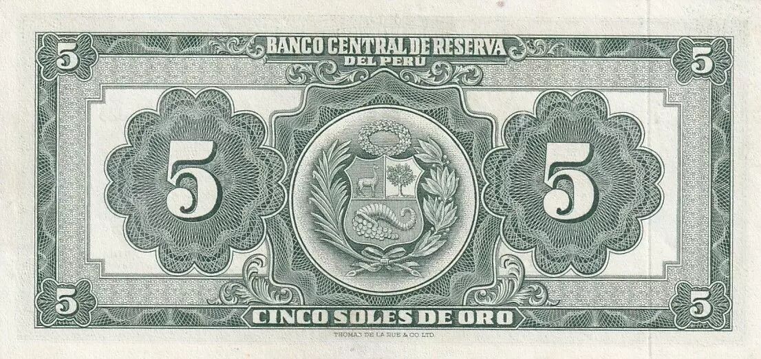 The back of the banknote is printed in green. It features the national coat of arms of Peru in the center. The inscriptions, also in Spanish, read: "BANCO CENTRAL DE RESERVA DEL PERU CINCO SOLES DE ORO".