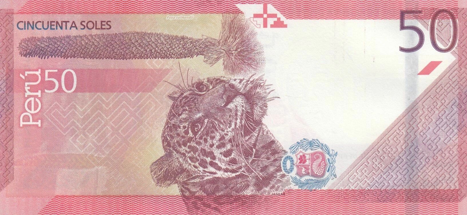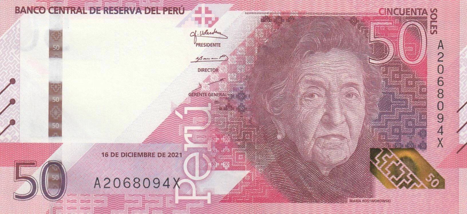 The 50 Soles banknote, issued by Peru, commemorates María Rostworowski and the Jaguar. This banknote was issued between 2019 and 2021 and is part of the series ranging from A to X.