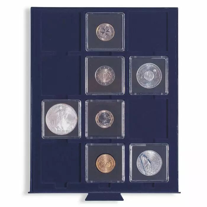 Tiroir transparent, fond bleu avec 12 cases carrées pour monnaies jusqu'à 50 mm Ø.