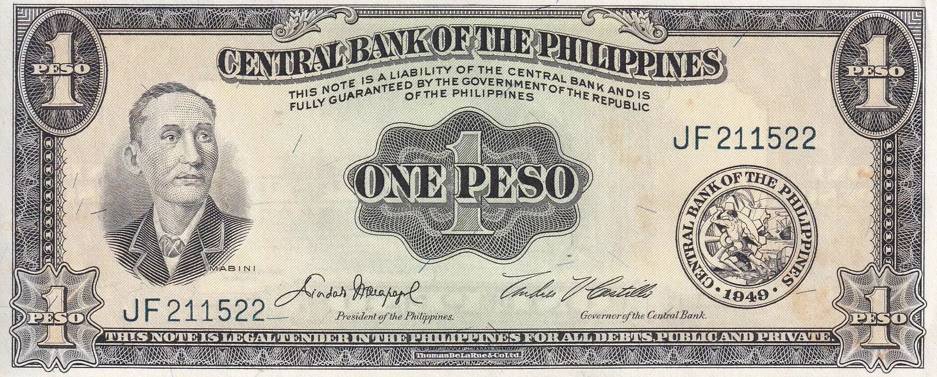 Billet Philippines 1 Peso - Mabini - Eglise - Série JF - 1949 - P.133