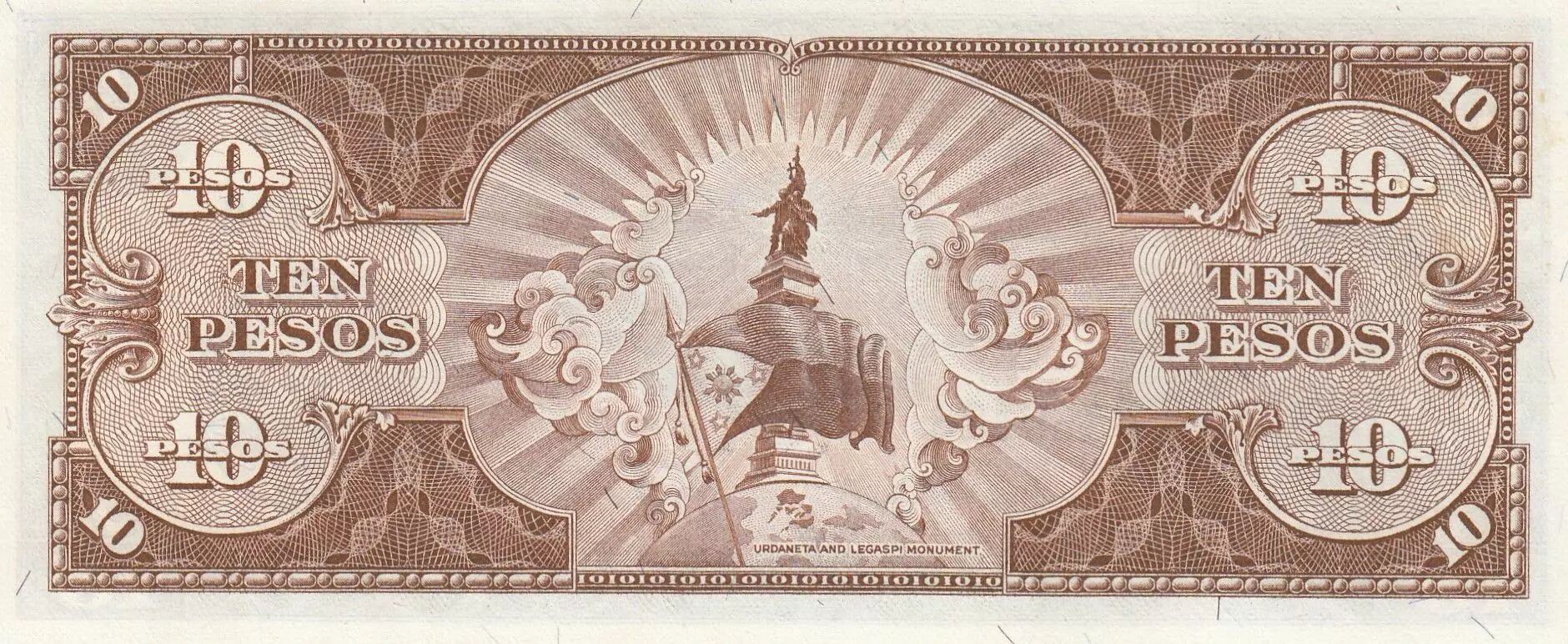 The reverse of the banknote depicts the Urdaneta and Legaspi monument, occupying a central position in the composition. This monument commemorates two important historical figures in the history of the Philippines.
