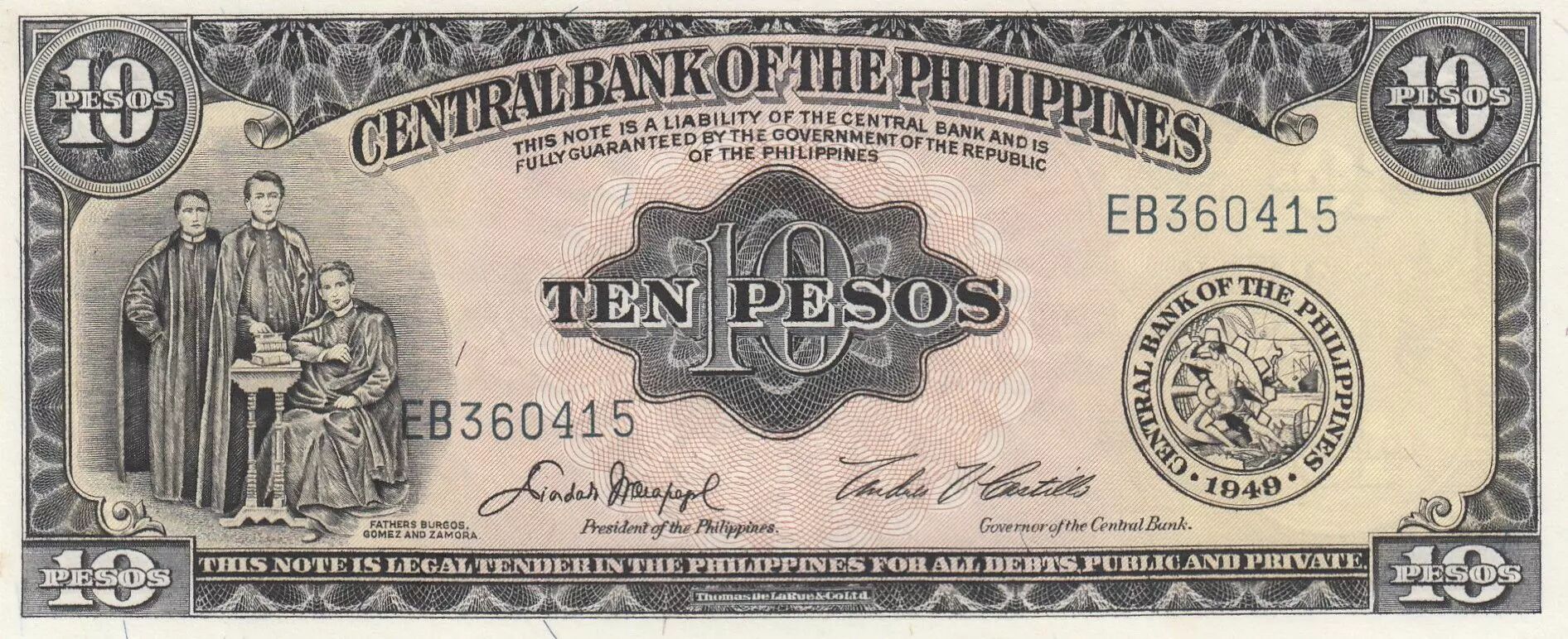Ce billet de banque, d'une valeur nominale de 10 pesos, a été émis aux Philippines en 1949. Il fait partie d'une série commémorative, identifiée par le préfixe "EB".