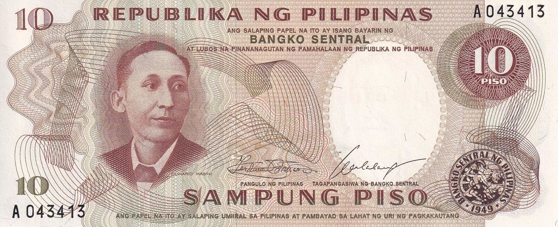 Banknote Philippines 10 Piso - A. Mabini - Church - ND (1969) - P.144a