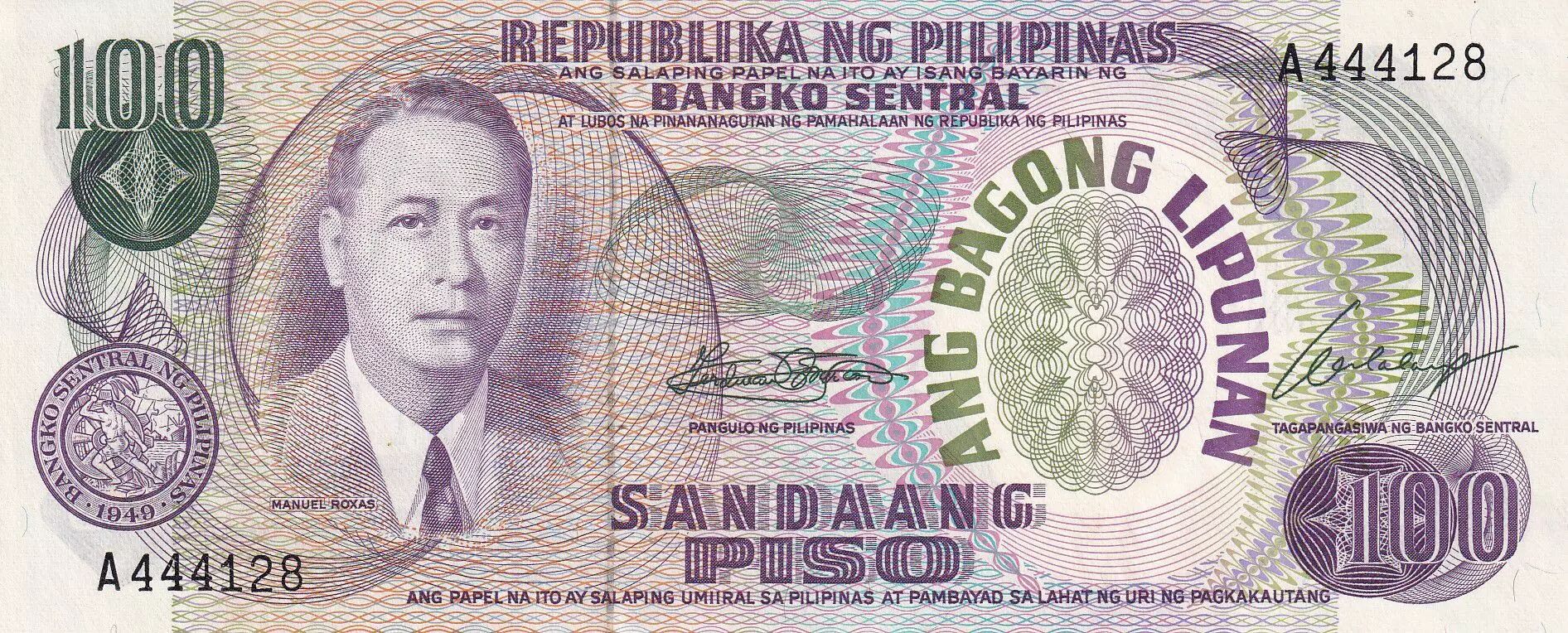 Banknote Philippines 100 Peso - Manuel Roxas - Central - BankND (1969) - Serial A - P.147a