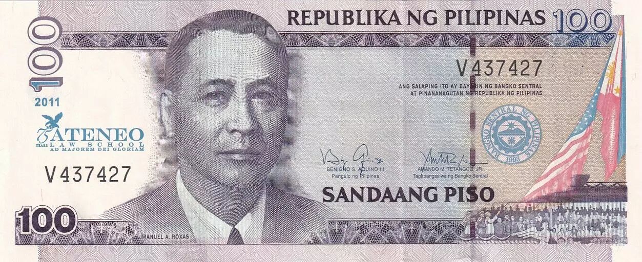 The 100 Philippine Peso banknote, issued in 2011, commemorates the 75th anniversary of Ateneo. It has a rectangular format of 160 mm in length and 66 mm in width.