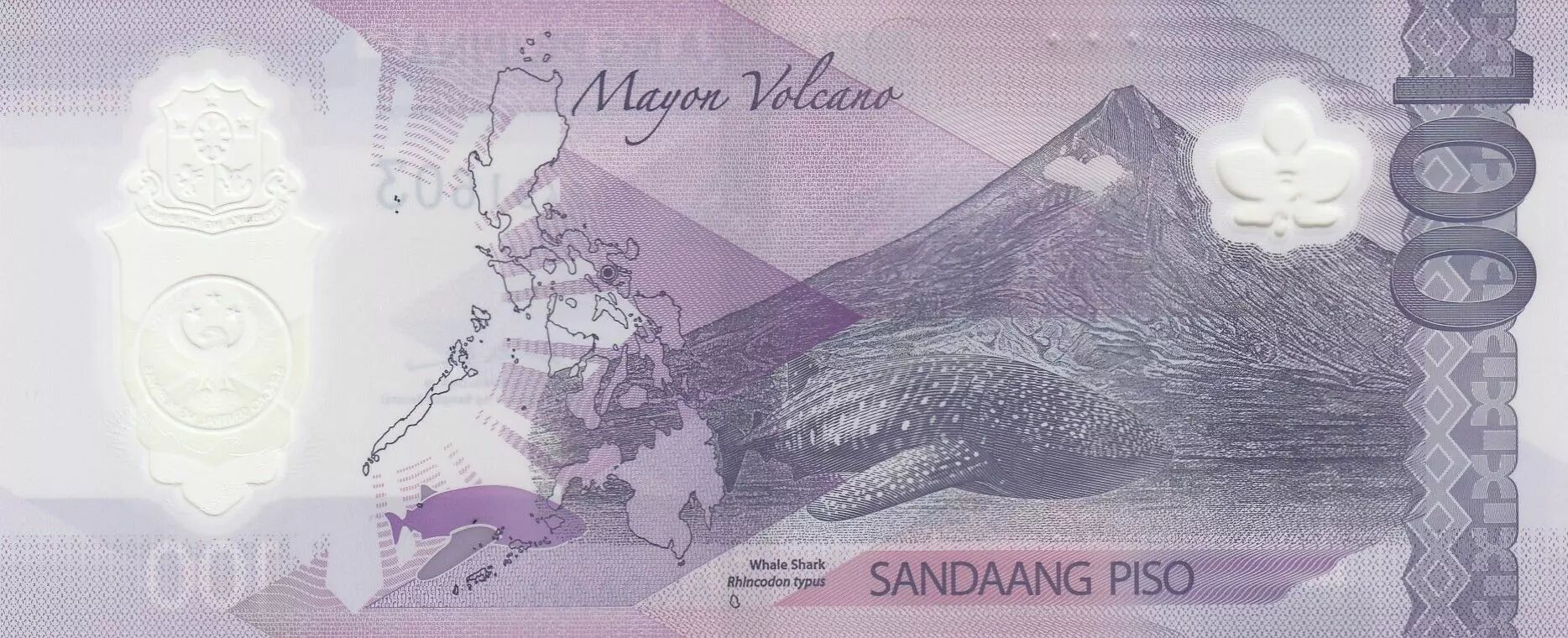 The reverse highlights emblematic elements of the country, with a map of the Philippines, a whale shark (Rhincodon typus) in the center, and the Mayon Volcano on the right, accompanied by the mentions 'Mayon Volcano' and 'Whale Shark'.