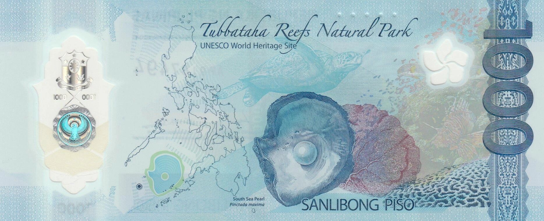 The back of the banknote features a sea turtle, highlighting the marine biodiversity of the Philippines. The turtle's scientific name is also indicated. Ornamental motifs and indigenous graphic elements complete the design. The face value of 1000 Piso is repeated on the back. The phrase "Central Bank of the Philippines" is also present, identifying the issuing institution. A barcode or unique serial number is printed on the banknote to facilitate its tracking and identification.