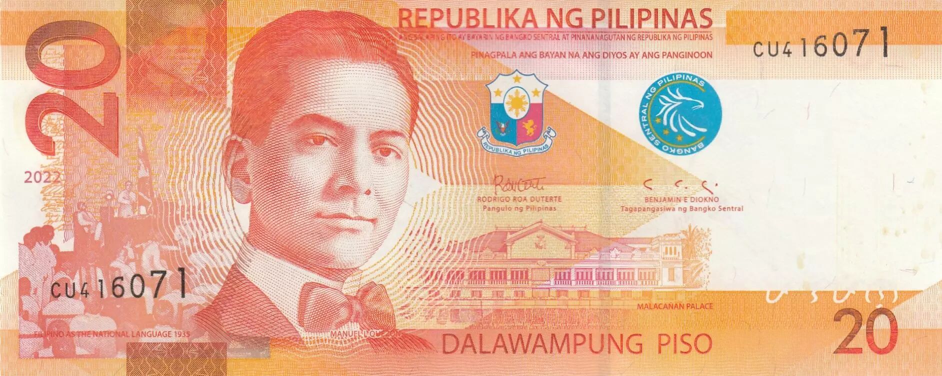 Billet Philippines 20 Piso - M.L. Quezon - Civette - 2022 - Série CU