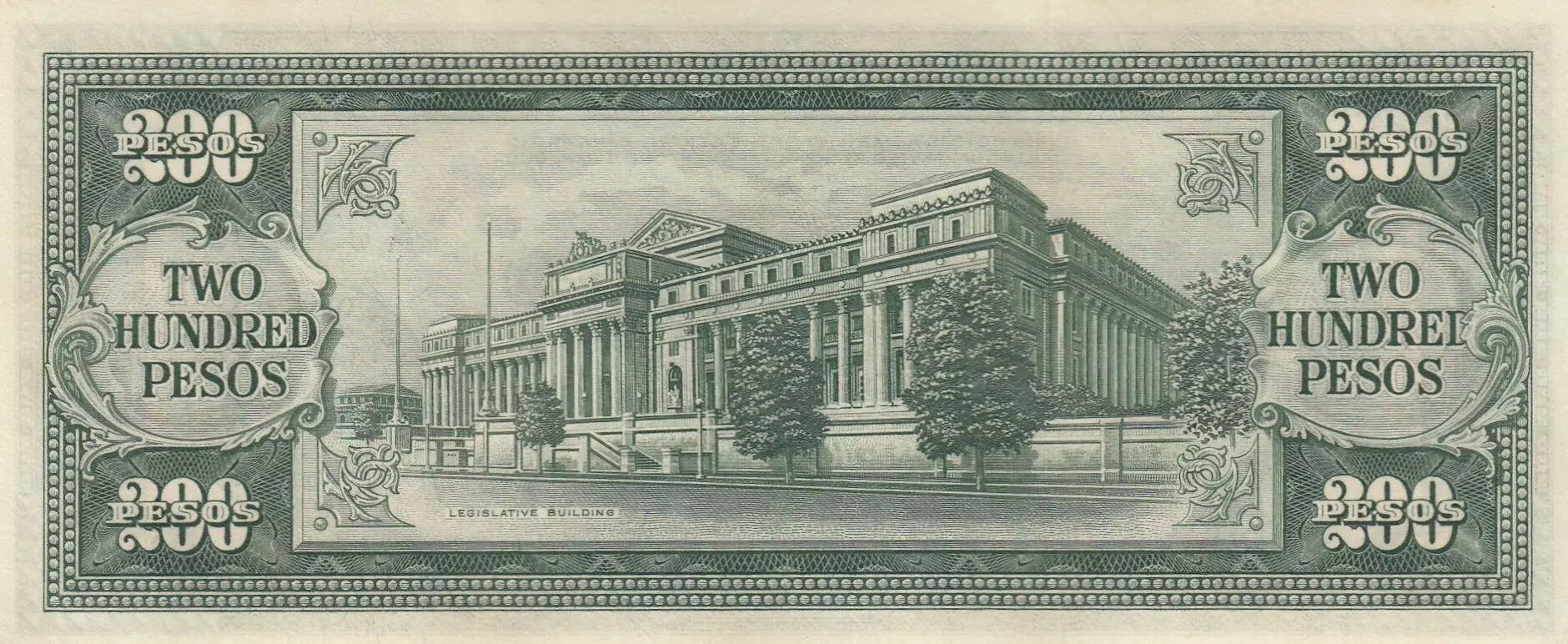 This 200 Peso banknote, due to its design and the personalities it represents, is a collector's item prized by numismatists and testifies to a specific era in Philippine history.
