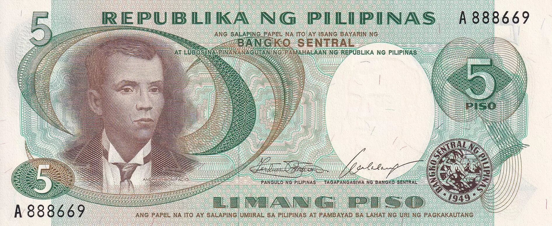 Banknote Philippines 5 Piso - A. Bonifacio - Katipunan - 1969 - UNC - P.143a