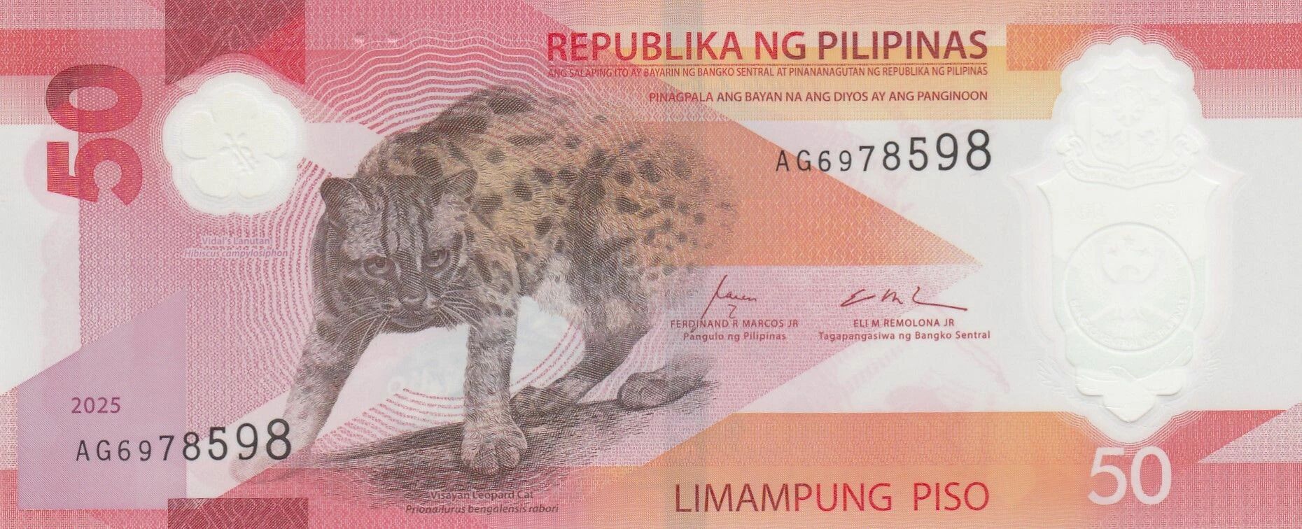 This banknote is issued by the Philippines, with a face value of 50 piso. It is a polymer banknote, dated 2025 and part of the AG series.