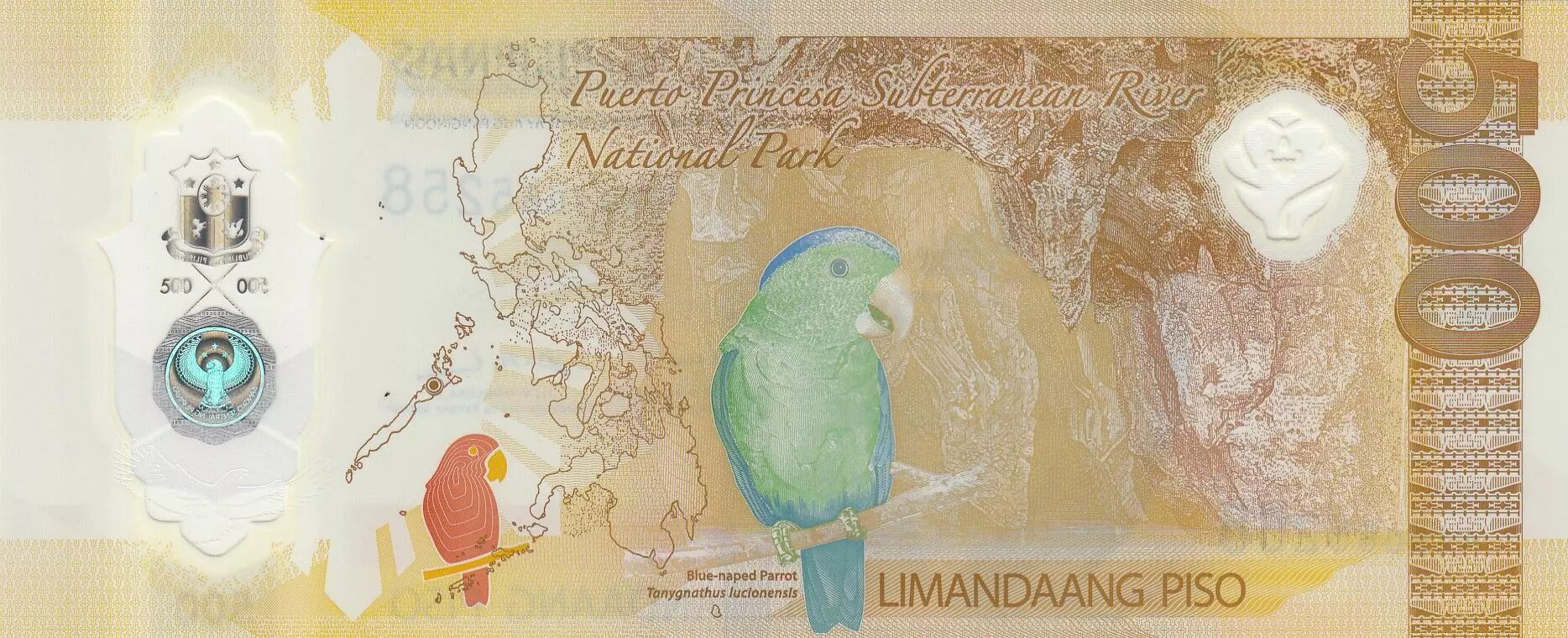 On the reverse, a map of the Philippines is depicted on the left, while a blue-naped parrot (Tanygnathus lucionensis), a colorful and emblematic species, occupies the center. To the right unfolds the natural landscape of the Puerto-Princesa Subterranean River National Park, a UNESCO World Heritage Site. These elements are accompanied by the mentions ?Puerto-Princesa Subterranean River National Park?, ?Blue-Naped Parrot? and the face value ?500 / Limandaang Piso.?