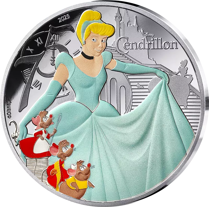 The coin's design pays tribute to the story of Cinderella, a young girl reduced to servitude by her stepmother after the death of her father. Despite the cruel treatment, Cinderella retains her kindness and finds solace with animals. The opportunity to attend the royal ball arises thanks to her fairy godmother, who offers her a dress and magical glass slippers. At the ball, she dances with the prince, unaware of his identity. At midnight, the spell is broken, and Cinderella flees, losing a glass slipper. The prince sets out to find the young woman, and recognition occurs when Cinderella tries on the slipper again, sealing their future union.