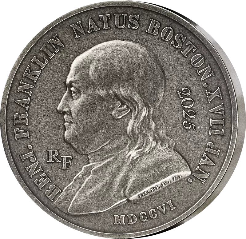 The coin is dedicated to Benjamin Franklin, a historical figure whose bust, inspired by the sculpture of Jean-Antoine Houdon, adorns the obverse. An inscription around the edge reads: "Benjamin Franklin born in Boston January 17, 1706". The initials "RF" and the year "2025" are discreetly integrated on either side of the bust.