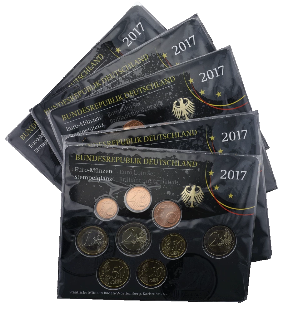 The German 2017 Brilliant Uncirculated (BU) set is a numismatic collection featuring the annual issues from the five German mints, identified by the letters A (Berlin), D (Munich), F (Stuttgart), G (Karlsruhe), and J (Hamburg). This set includes all eight euro denominations, ranging from 1 cent to 2 euros, minted in 2017.