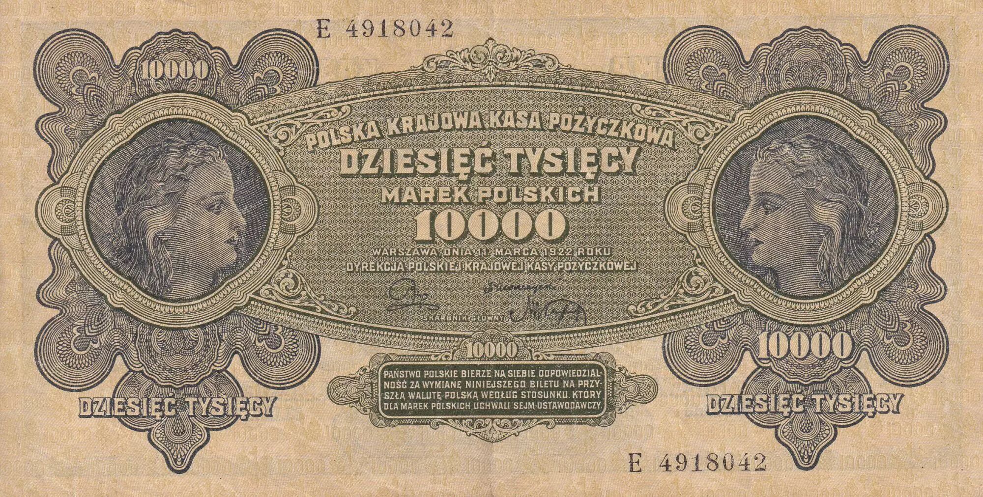 Banknote Poland 10000 Marek - Women - 1922 - Serial E - XF - P.32