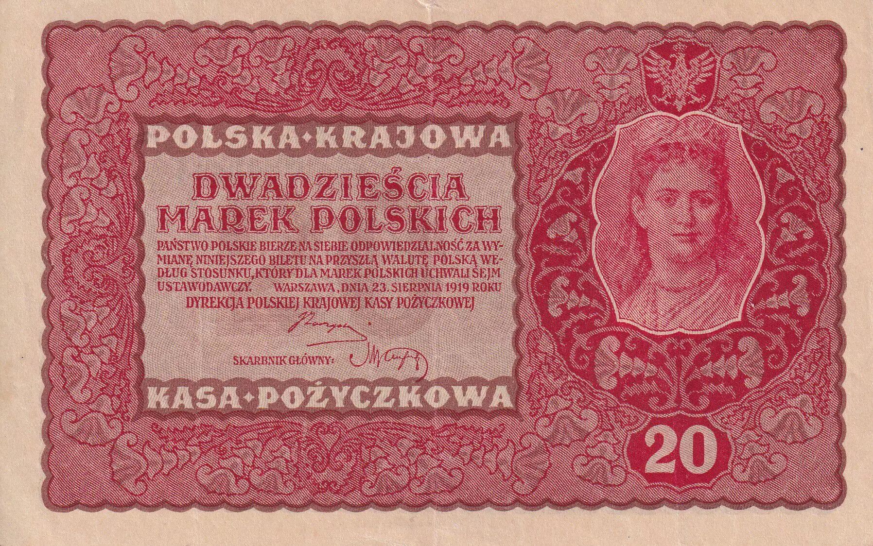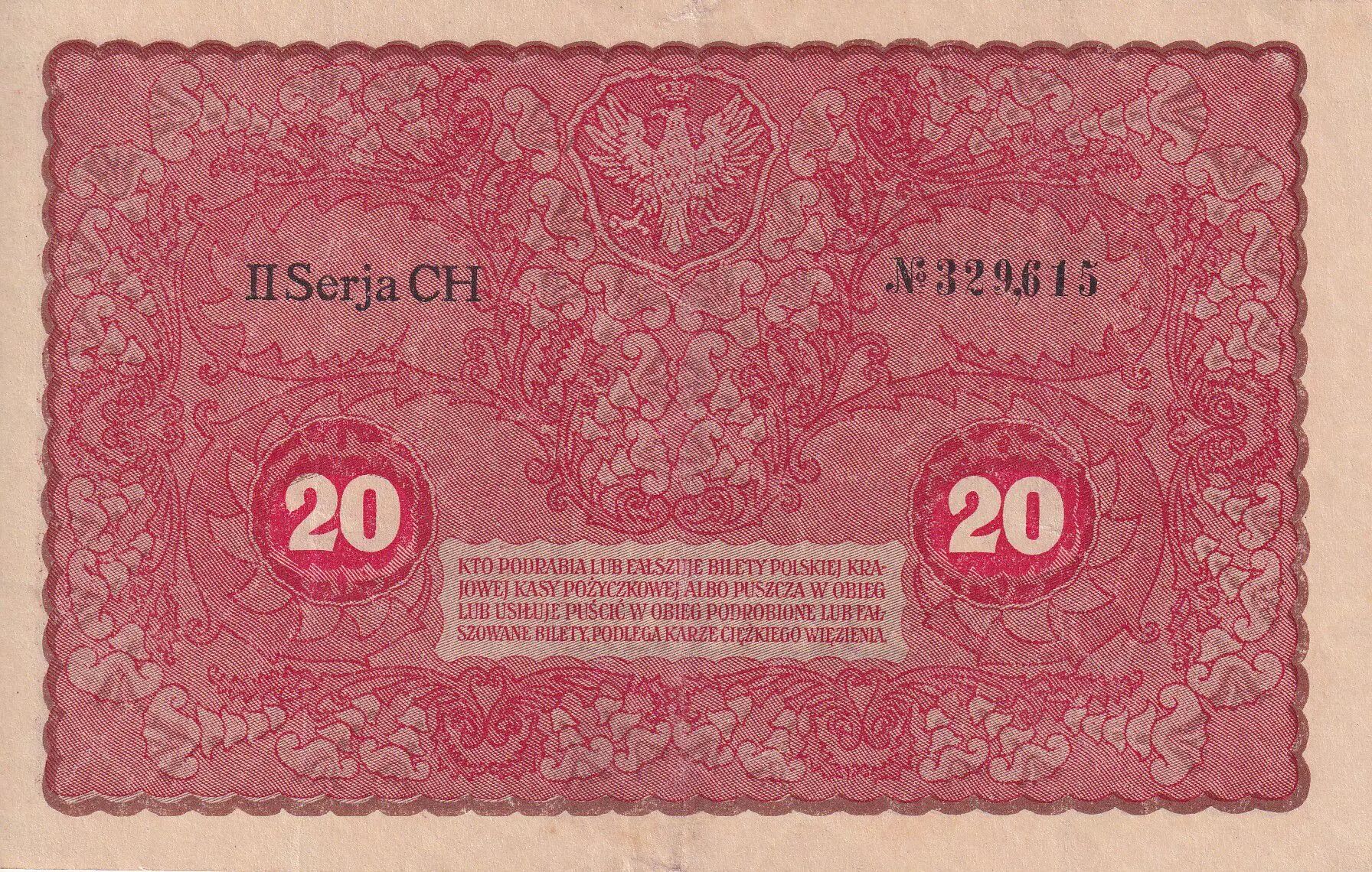 Banknote Poland 20 Marek - Woman head - Imperial eagle - 1919 - Serial CH - P.26
