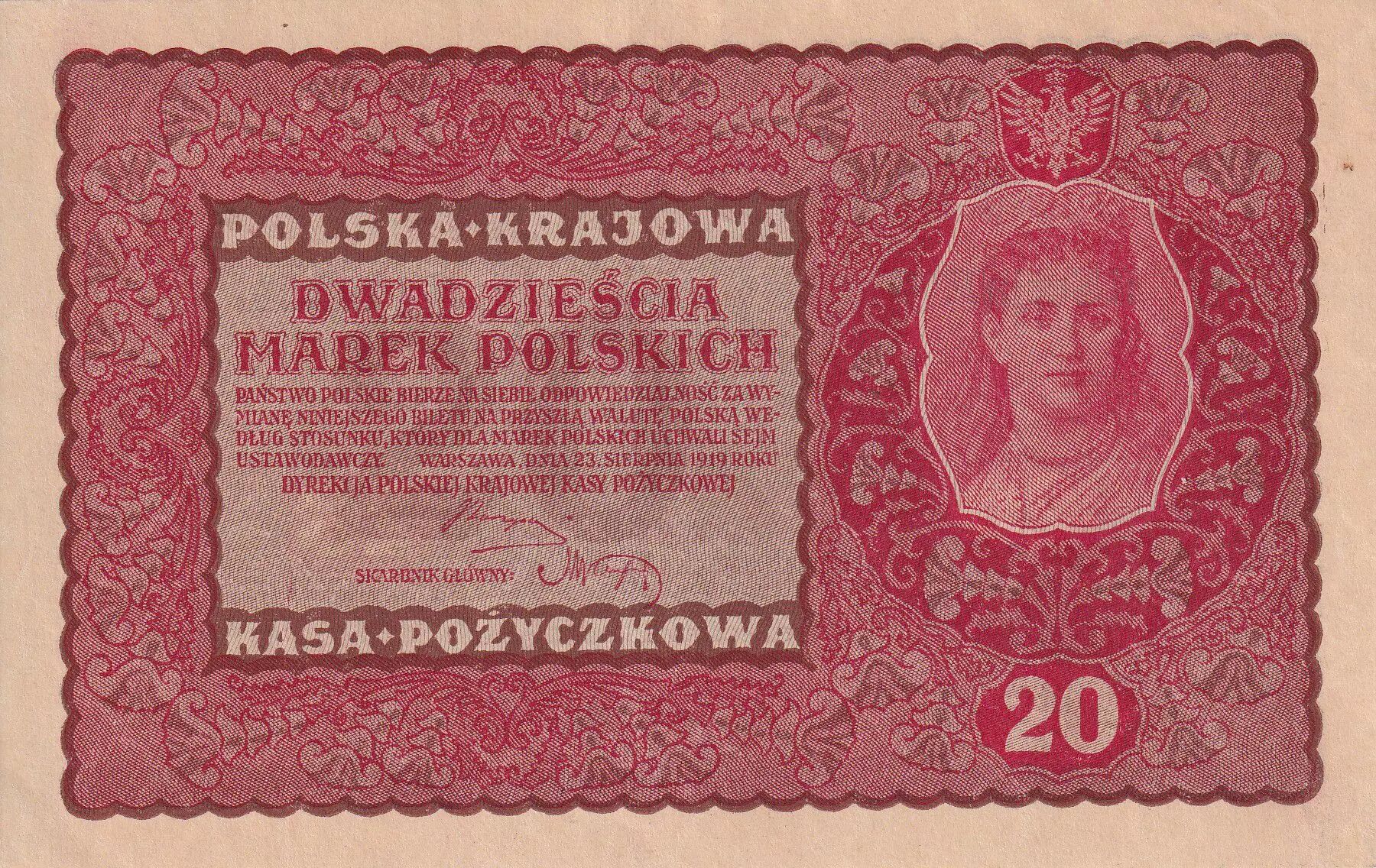 Banknote Poland 20 Marek - Woman head - Imperial eagle - 1919 - Serial EW - P.26