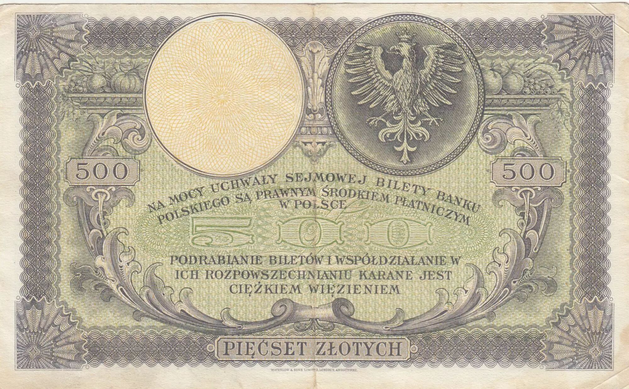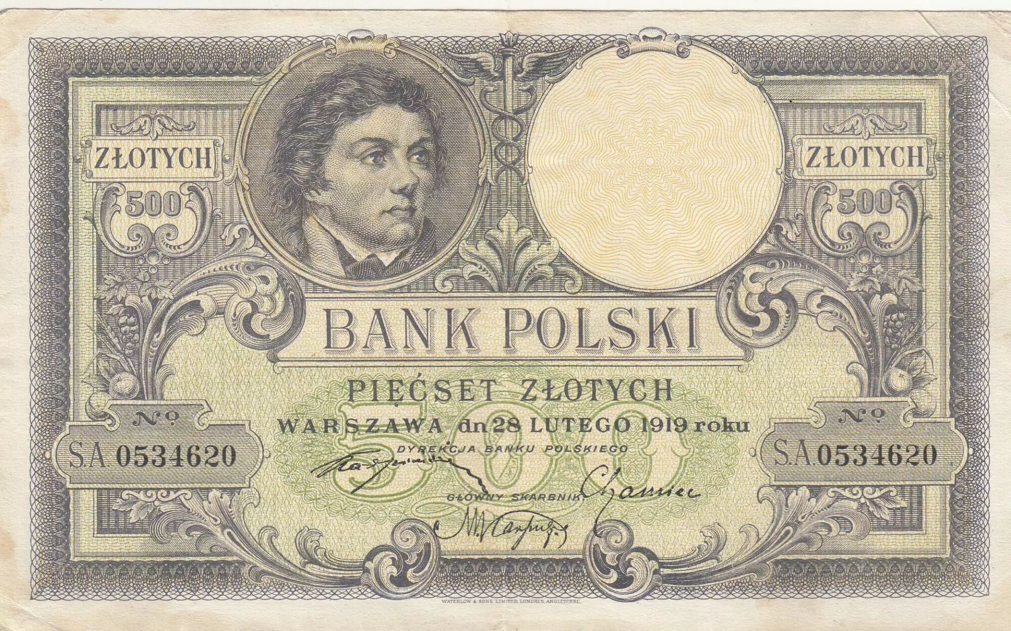 Home > World Banknotes > European Banknotes > Poland > Poland 500 Zlotych - T. Kosciuszko - Crowned Eagle - 28-02-1919 - Serial S.A.0534620