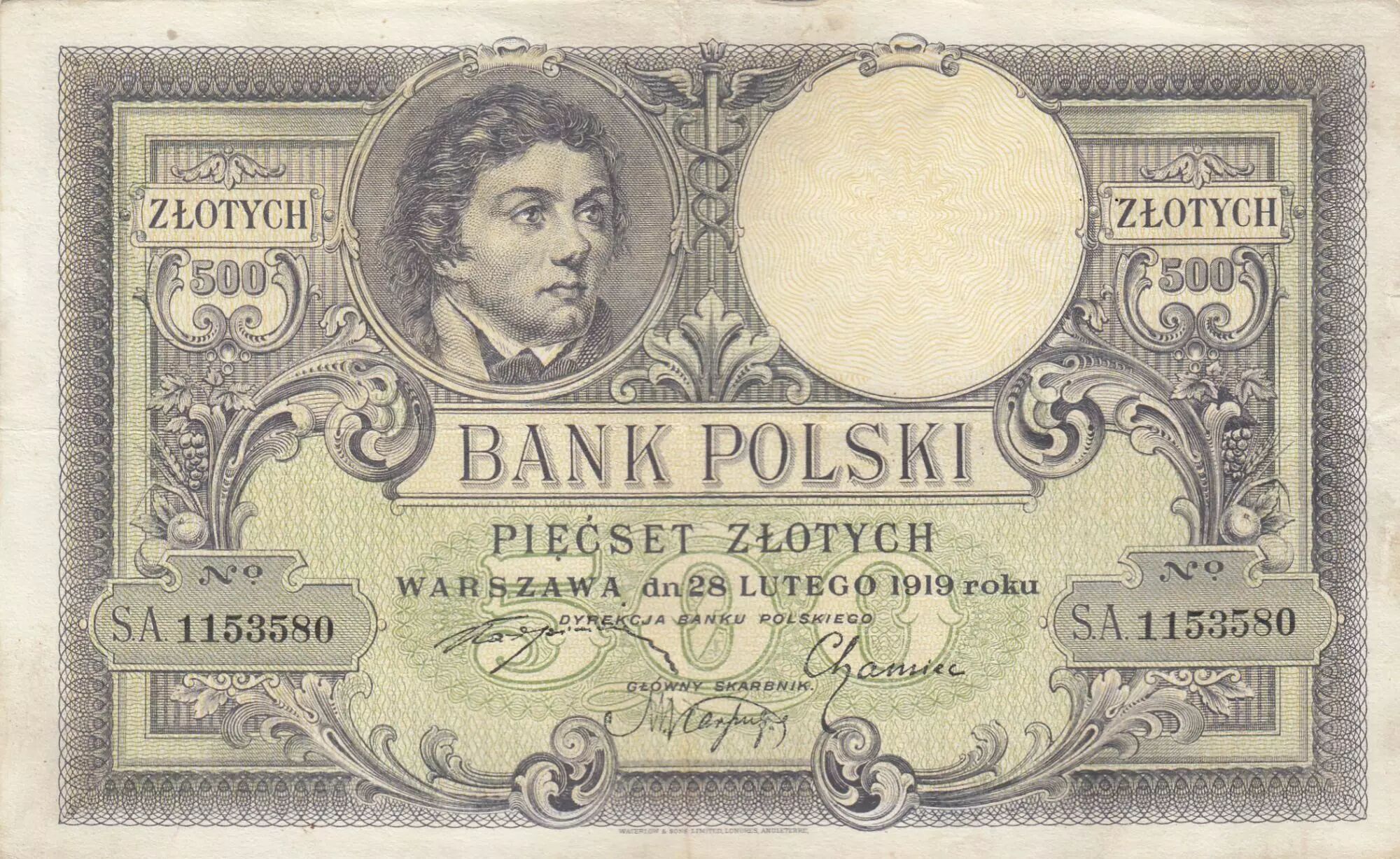 Home > World Banknotes > European Banknotes > Poland > Poland 500 Zlotych - T. Kosciuszko - Crowned Eagle - 28-02-1919 - Serial S.A.1153580