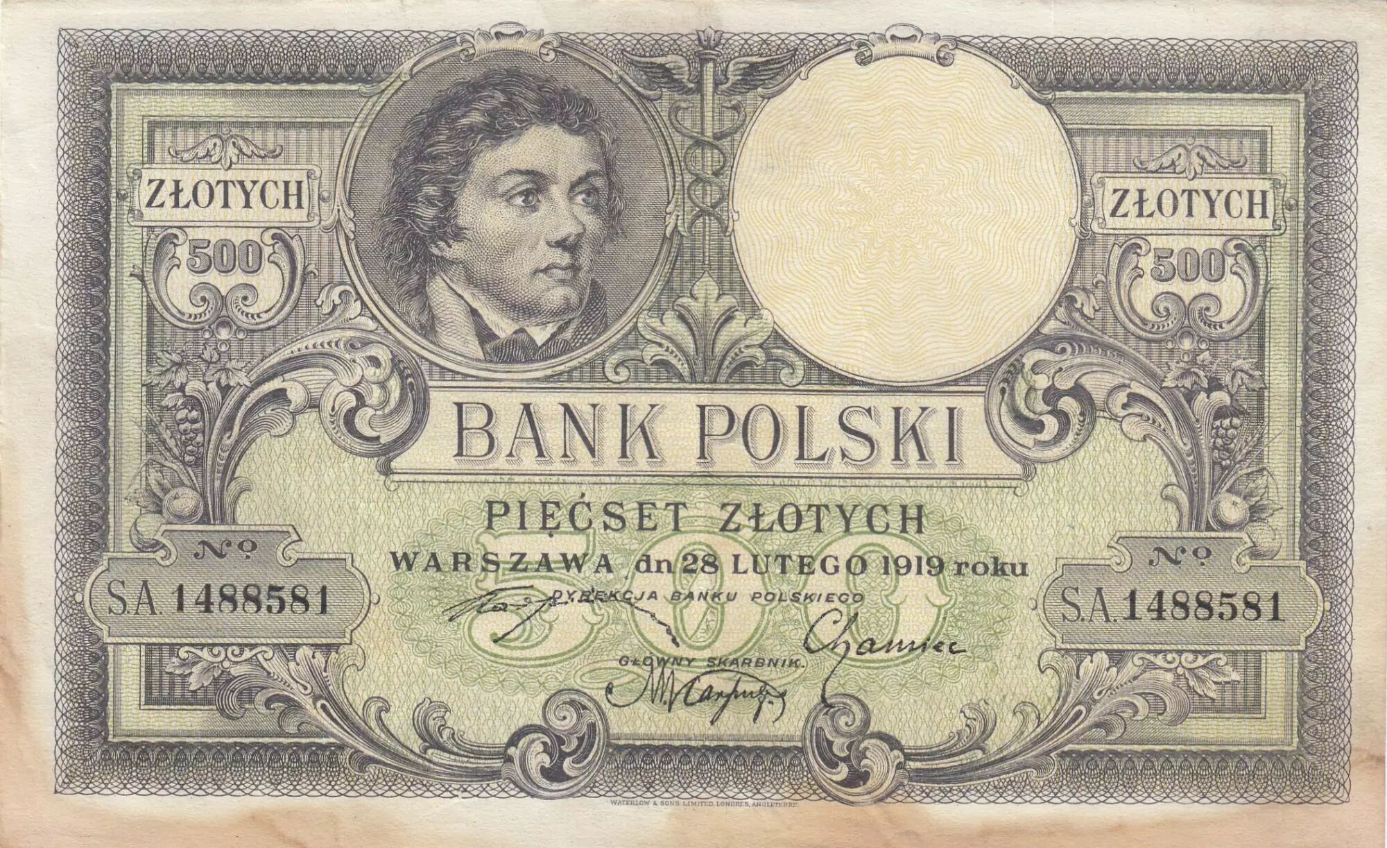 Home > > Poland 500 Zlotych - T. Kosciuszko - Crowned Eagle - 28-02-1919 - Serial S.A.1488581