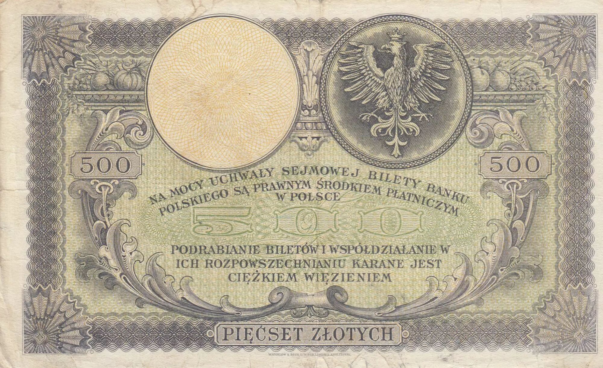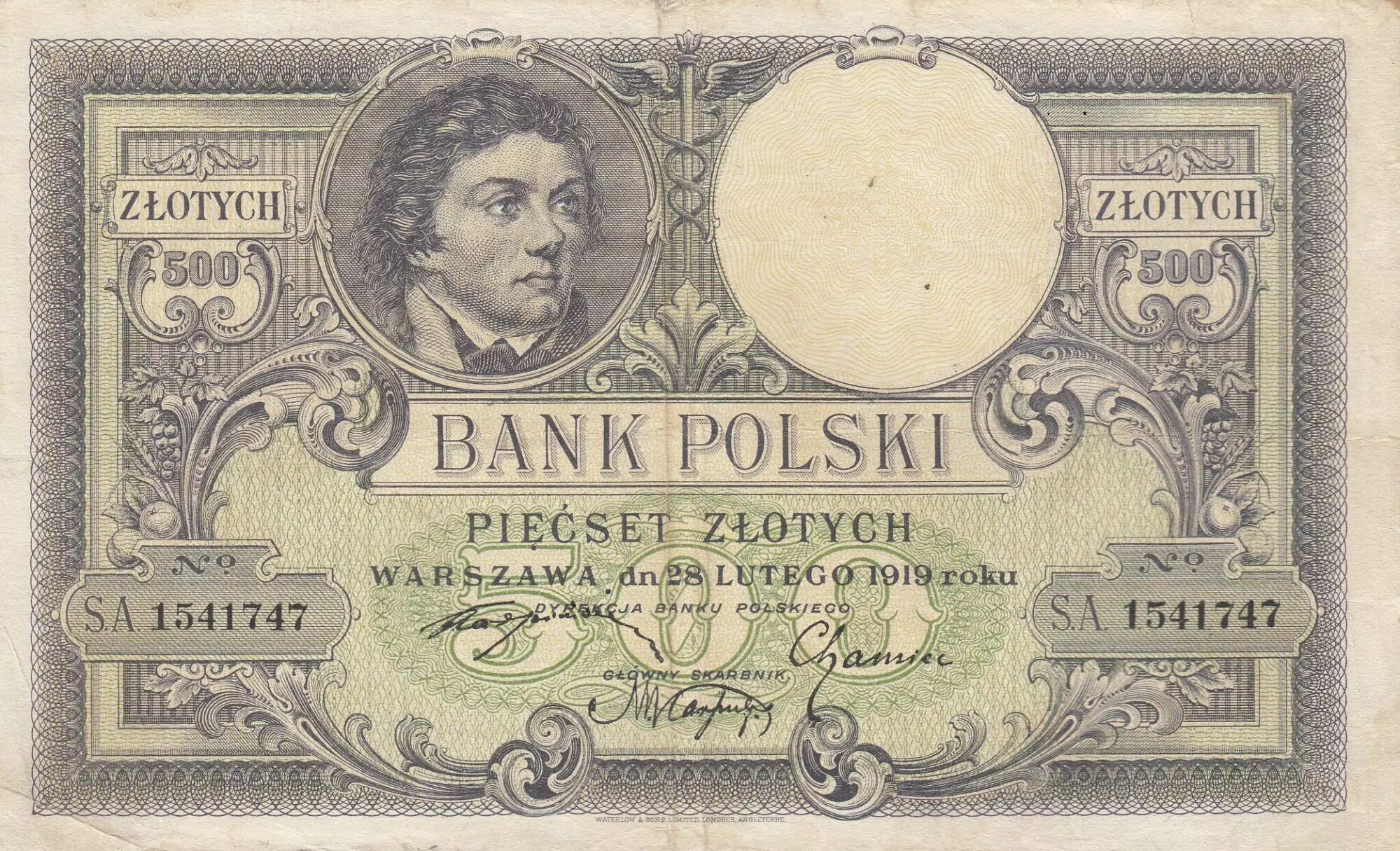 Home > World Banknotes > European Banknotes > Poland > Poland 500 Zlotych - T. Kosciuszko - Crowned Eagle - 28-02-1919 - Serial S.A.1541747