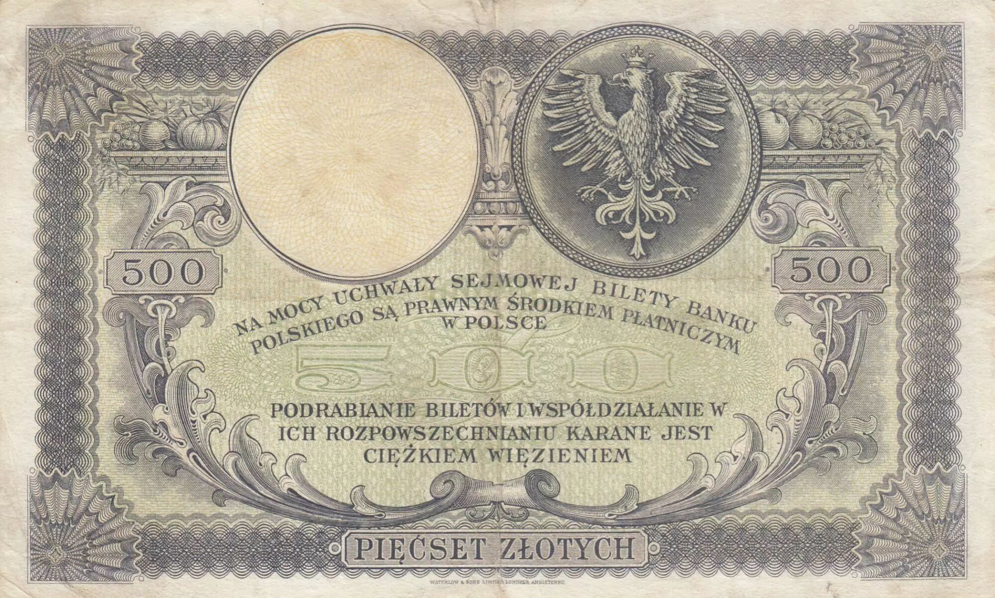 Home > World Banknotes > European Banknotes > Poland > Poland 500 Zlotych - T. Kosciuszko - Crowned Eagle - 28-02-1919 - Serial S.A.5754307