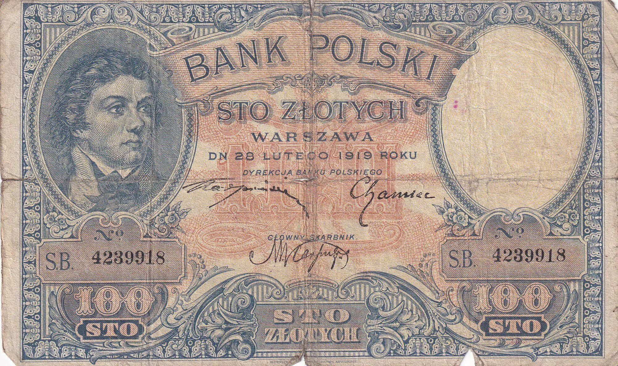 Accueil > Archivage > Pologne 100 Zlotych - T. Kosciuszko - Aigle couronné - 1919 - TB - P.57