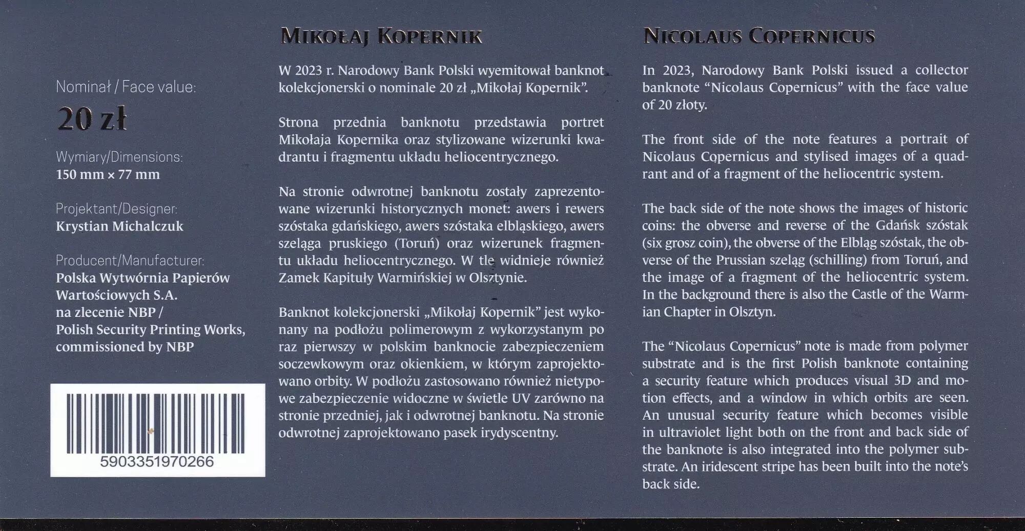 Accueil > Billets du Monde > Billets d'Europe > Pologne 20 Zlotych - Nicolas Copernic - Folder - Polymère - 2023