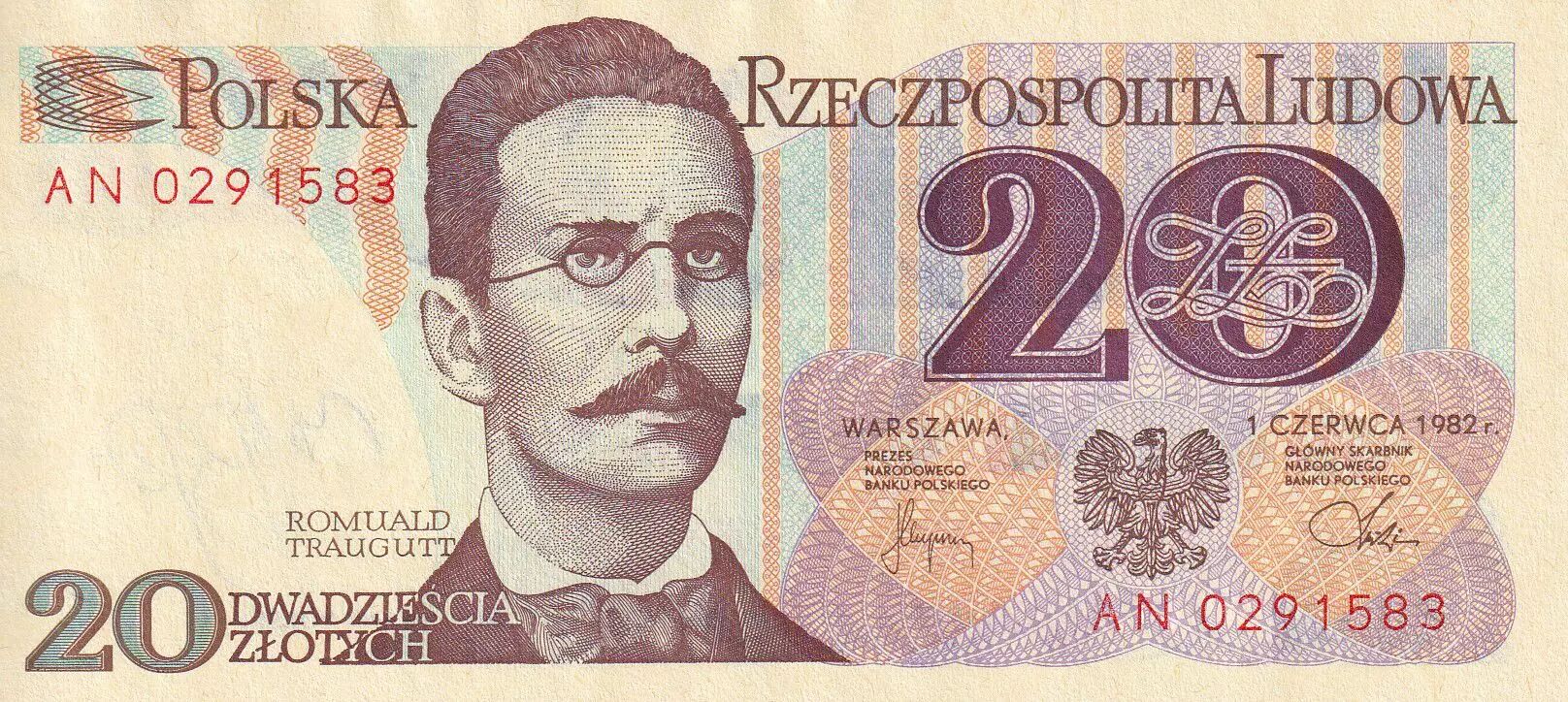 Accueil > Archivage > archivage-Billets du Monde > Pologne 20 Zlotych - Romuald Traugutt -1982 - NEUF - P.149a