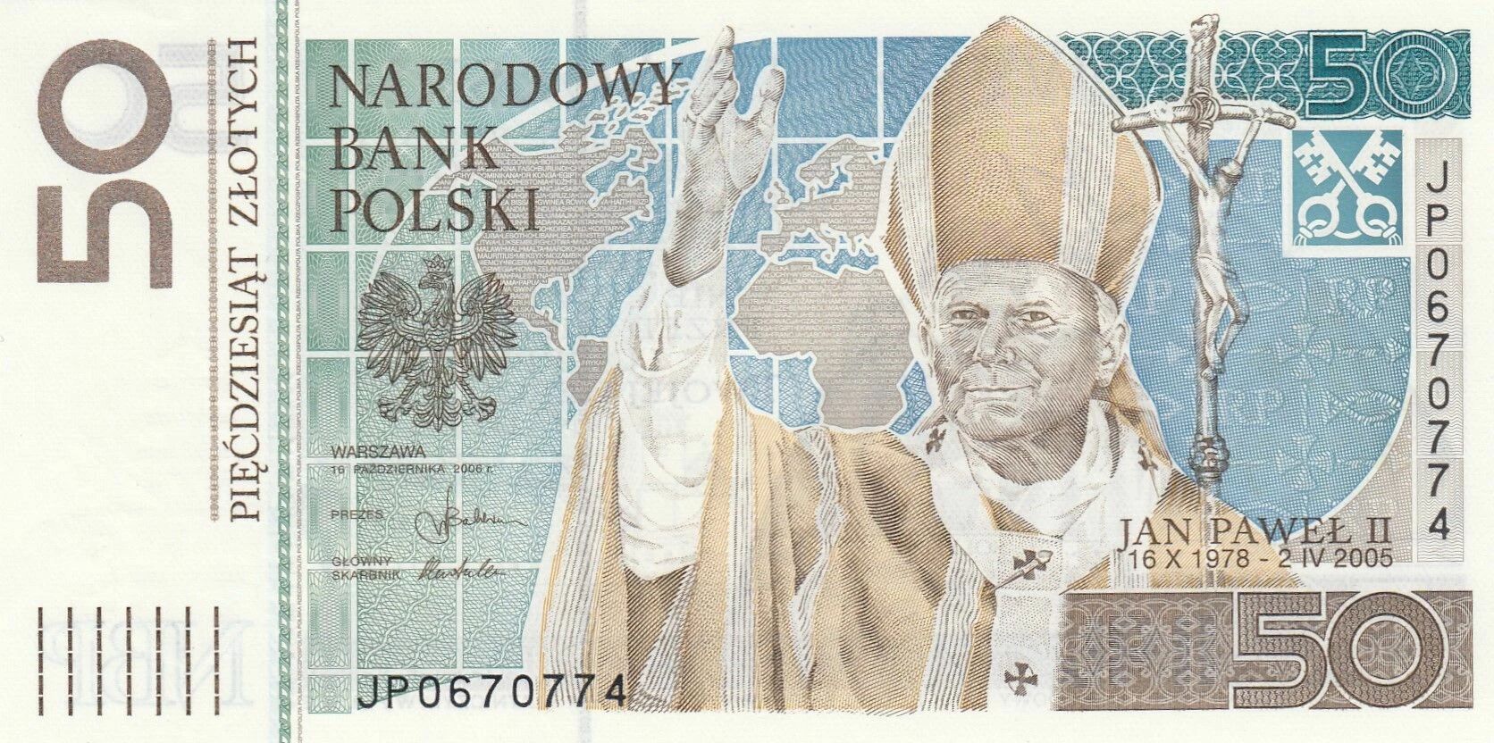 Ce billet de banque de Pologne est émis en 2006 et possède une valeur faciale de 50 zlotych. Il fait partie d'une série commémorative dédiée à Jean-Paul II.