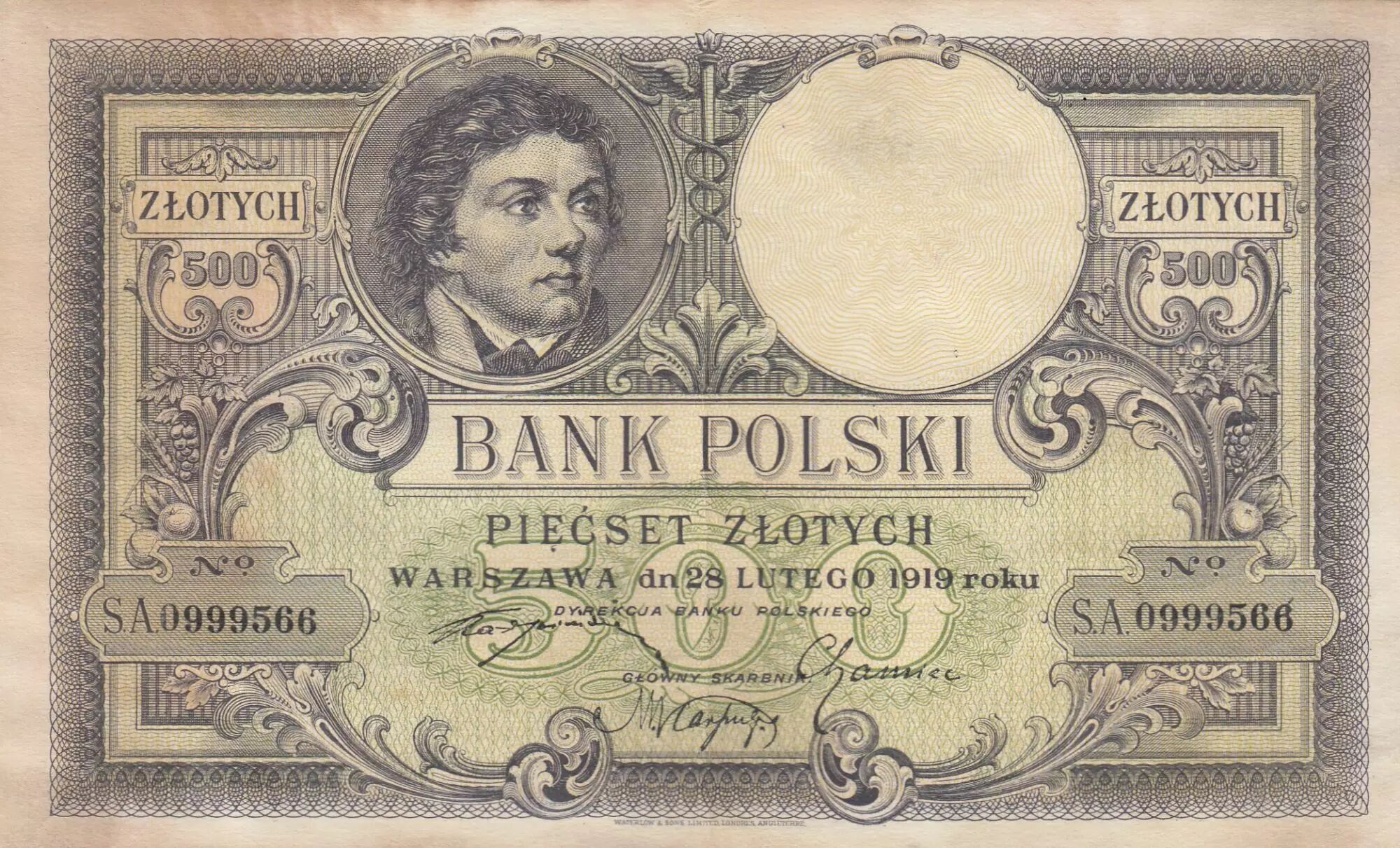 Accueil > Archivage > archivage-Billets du Monde > Pologne 500 Zlotych - T. Kosciuszko - Aigle couronné - 28-02-1919 - Série S.A.0999566