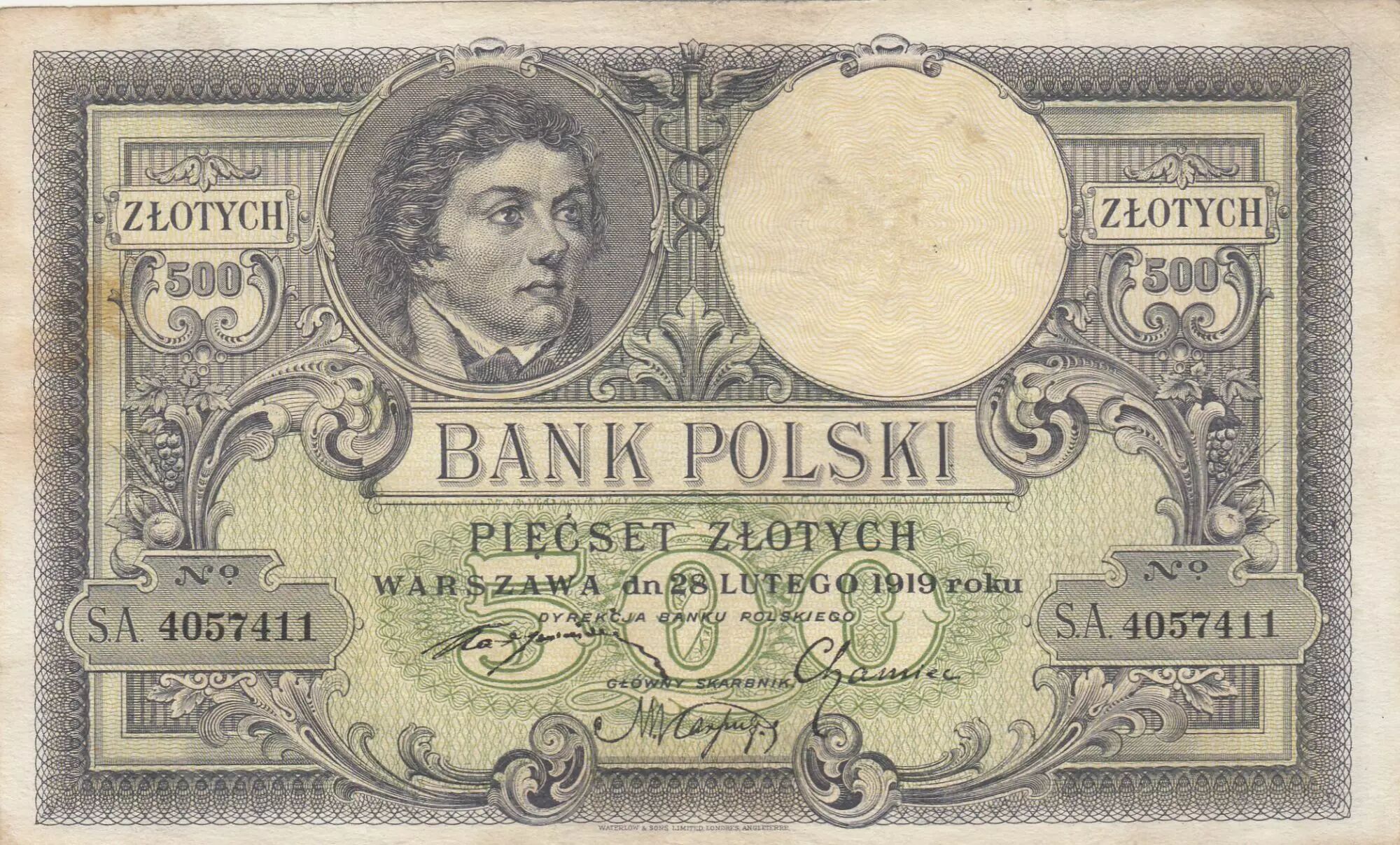 Accueil > Archivage > archivage-Billets du Monde > Pologne 500 Zlotych - T. Kosciuszko - Aigle couronné - 28-02-1919 - Série S.A.4057411
