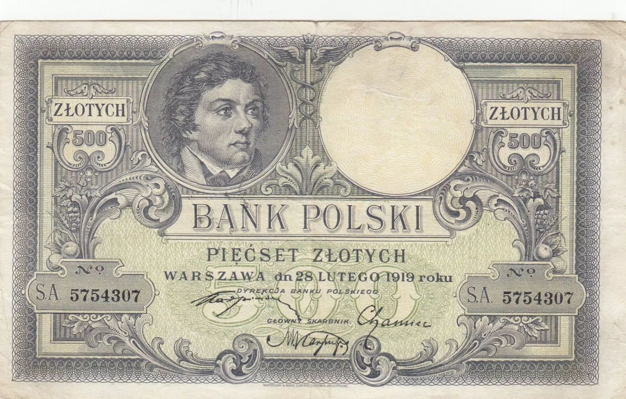 Billet Pologne 500 Zlotych - T. Kosciuszko - Aigle couronné - 28-02-1919 - Série S.A.5754307