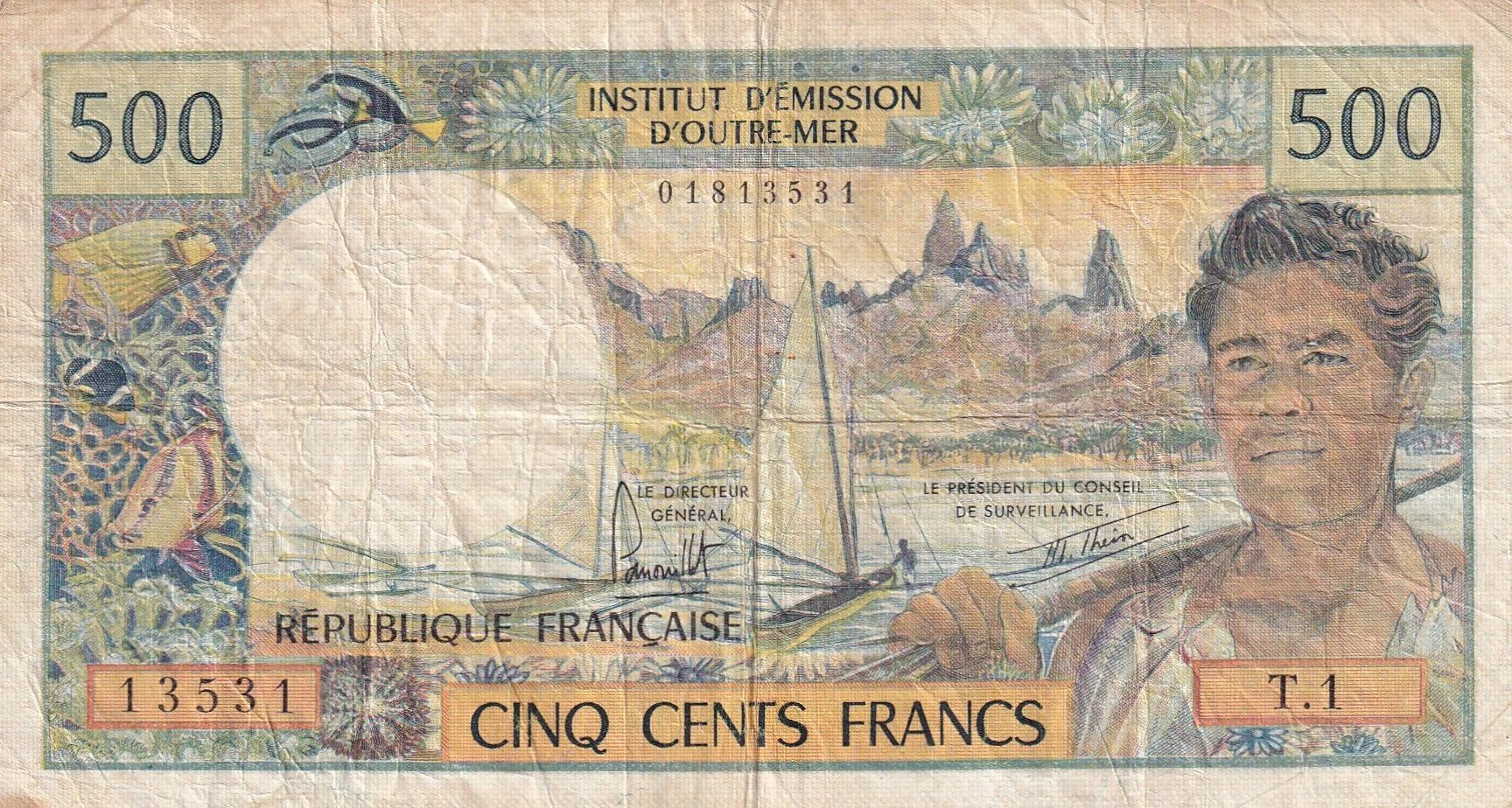Ce billet de banque de Polynésie Française a une valeur nominale de 500 francs. Il appartient à la série T.1 et a été émis entre 1970 et 1992.