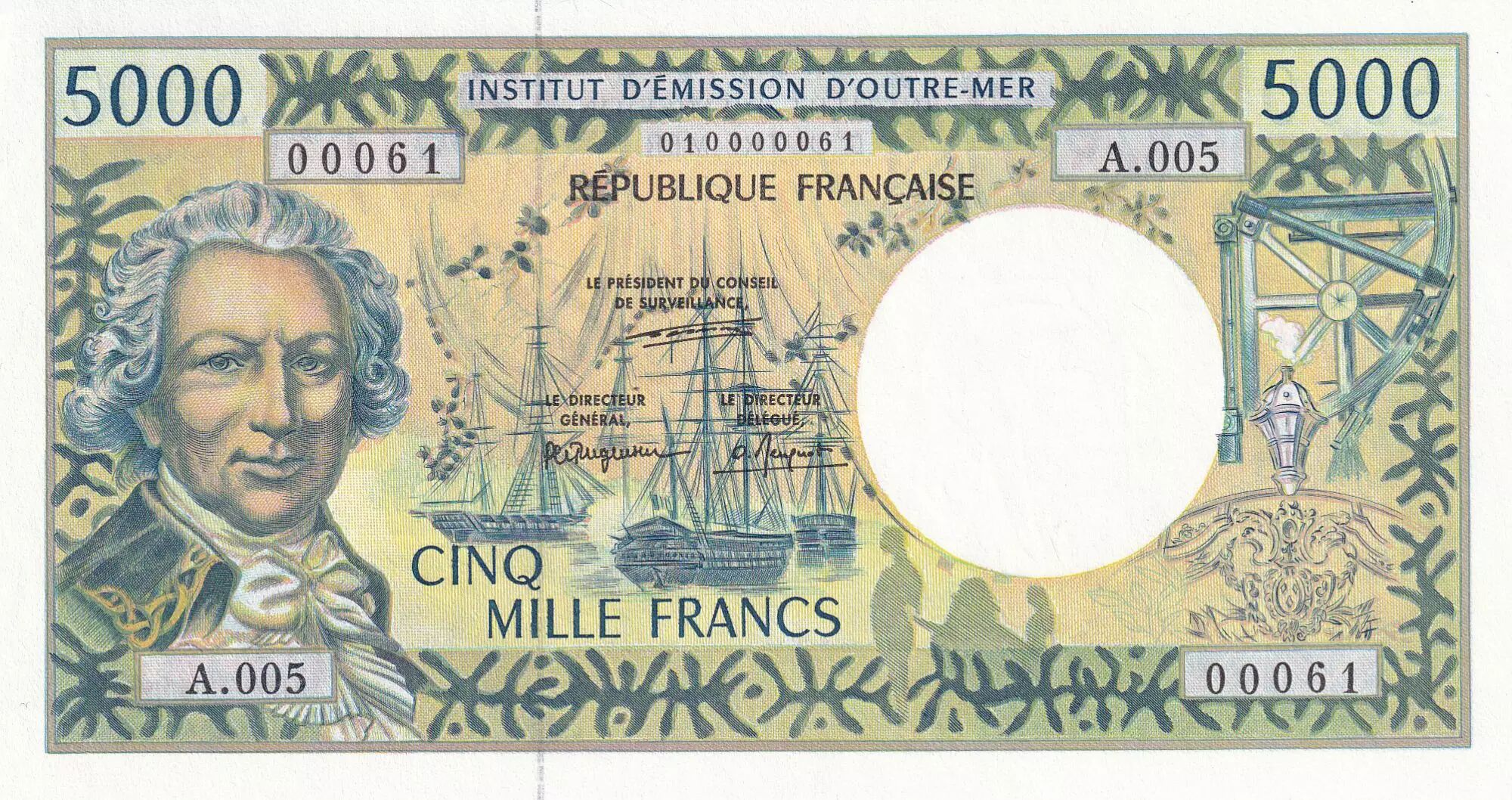Accueil > Archivage > Polynésie Fr. 5000 Francs - Bougainville - Trois-Mâts - ND (1996) - Série A.005 - P.3a