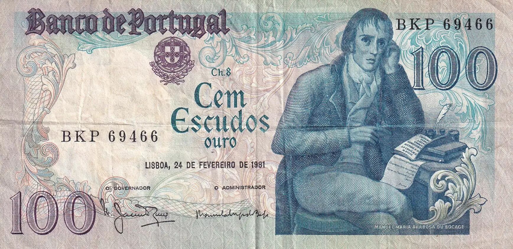 Accueil > Archivage > Portugal 100 Escudos - Manuel Barbosa Du Bocage - 1981 - Série BKP - P.178b