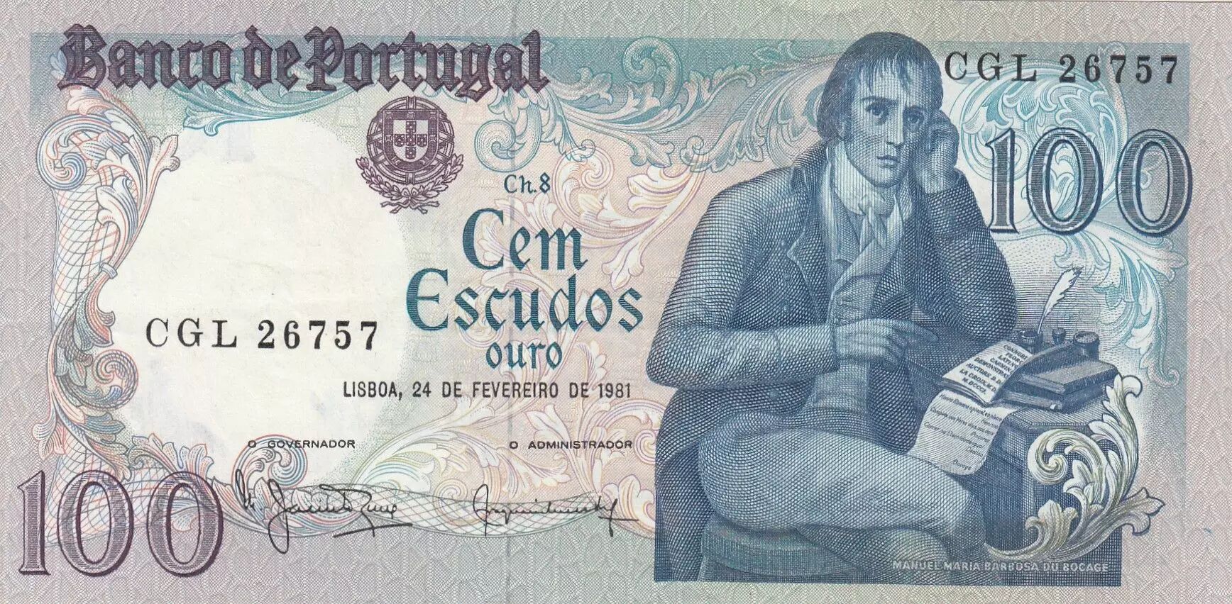 Home > World Banknotes > European Banknotes > Portugal > Portugal 100 Escudos - Manuel Barbosa Du Bocage - 24-02-1981 - Serial CGL