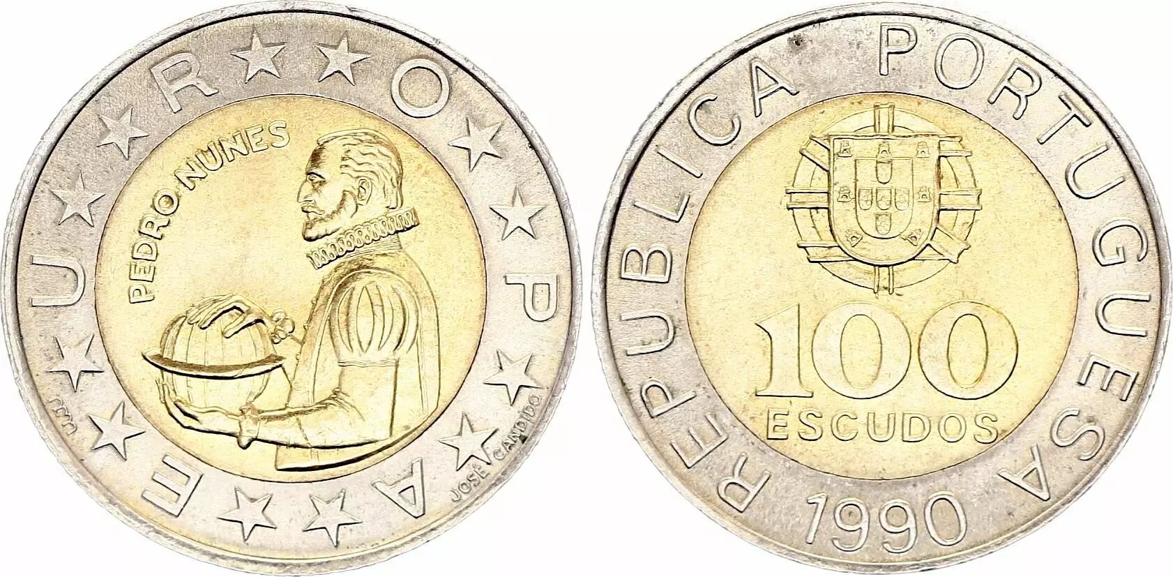 La pièce de 100 Escudos du Portugal, émise en 1990, rend hommage à Pedro Nunes, l?un des plus grands mathématiciens et cosmographes portugais du XVIe siècle. Connu pour ses contributions essentielles à la navigation, Nunes a développé des concepts innovants en géométrie et en cartographie, qui ont permis de faire progresser l'exploration maritime portugaise. Sur l?avers de la pièce, un portrait de Pedro Nunes est gravé avec une expression réfléchie, symbolisant son génie scientifique et son influence durable sur les sciences nautiques.