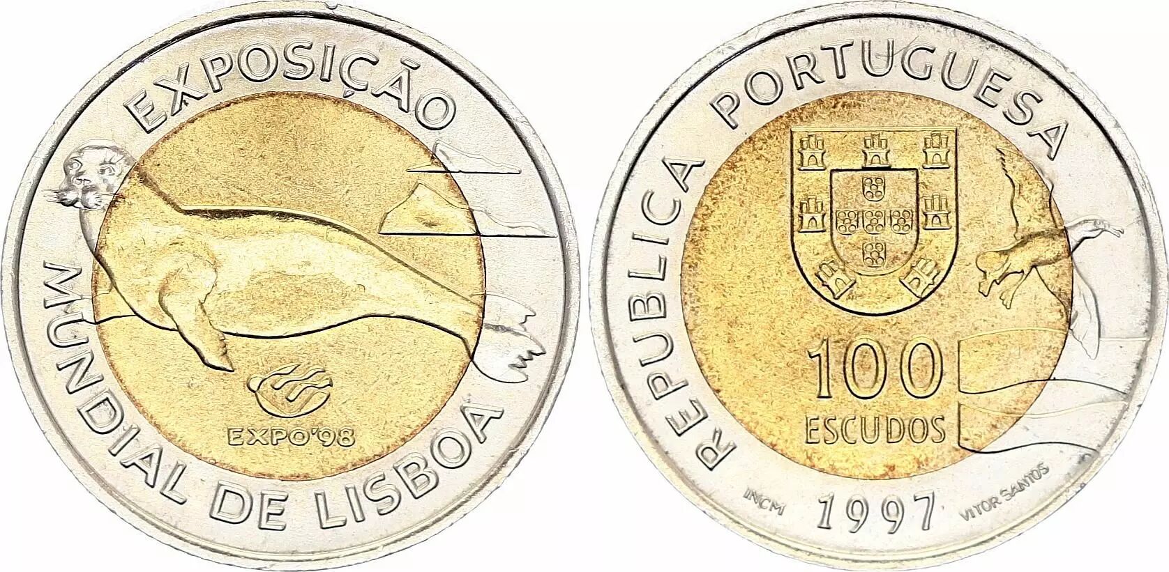 The 100 Escudos coin from Portugal, issued in 1997, celebrates Expo 98, a world exposition held in Lisbon with a theme focused on the oceans and dedicated to marine environmental preservation. Featuring the image of a seal, an emblematic species of marine fauna, this coin aims to raise public awareness of the need to protect marine ecosystems and promote biodiversity. The seal, carefully detailed on the obverse of the coin, symbolizes the beauty and fragility of the oceans in the face of growing ecological threats.