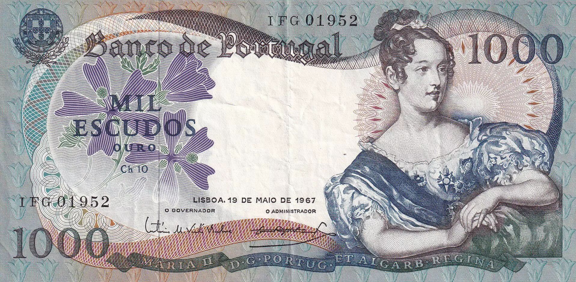 Home > > Portugal 1000 Escudos - Queen Maria II - 1963 - VF - P.172a